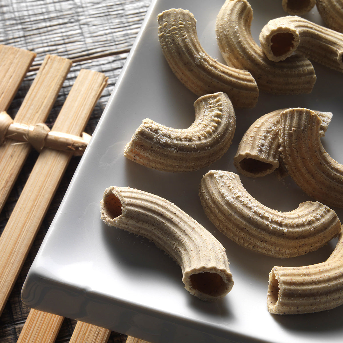 Inserisci un piccolo pezzo di impasto nella tramoggia di Regina e ruota la manovella. Dopo qualche istante la pasta uscirà dalla trafila. Quando avrà raggiunto la lunghezza desiderata, taglia la pasta con l’apposito archetto.
