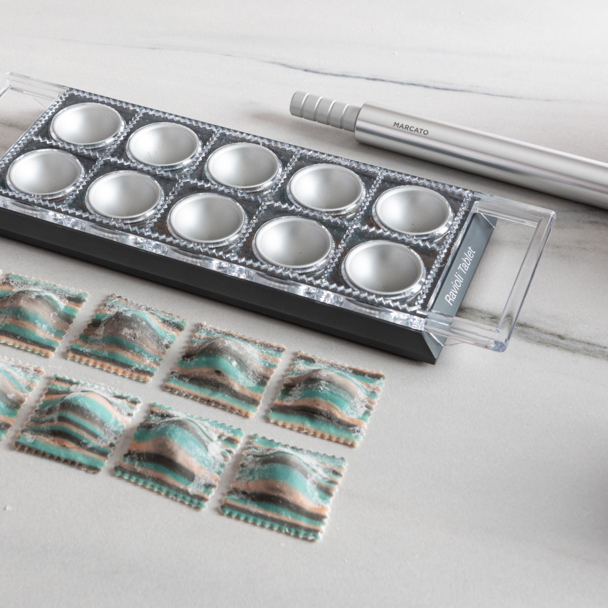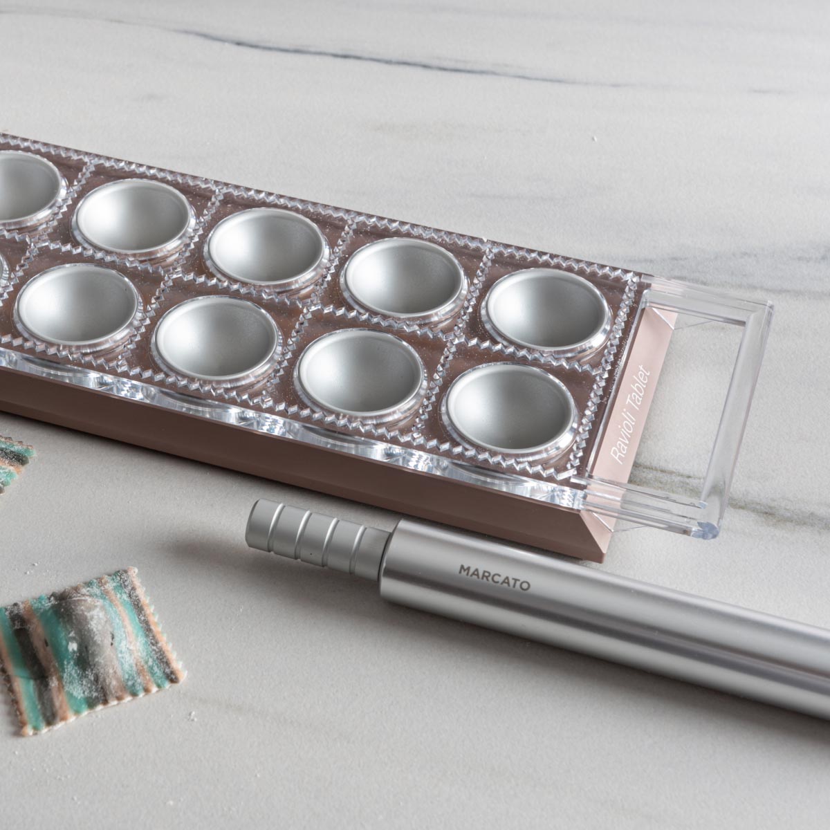 Ravioli Tablet, geniale tavoletta per pasta ripiena, è il modo più semplice e divertente per prepare gustosi ravioli in pochi minuti. Il mattarello, in alluminio anodizzato, è in dotazione.