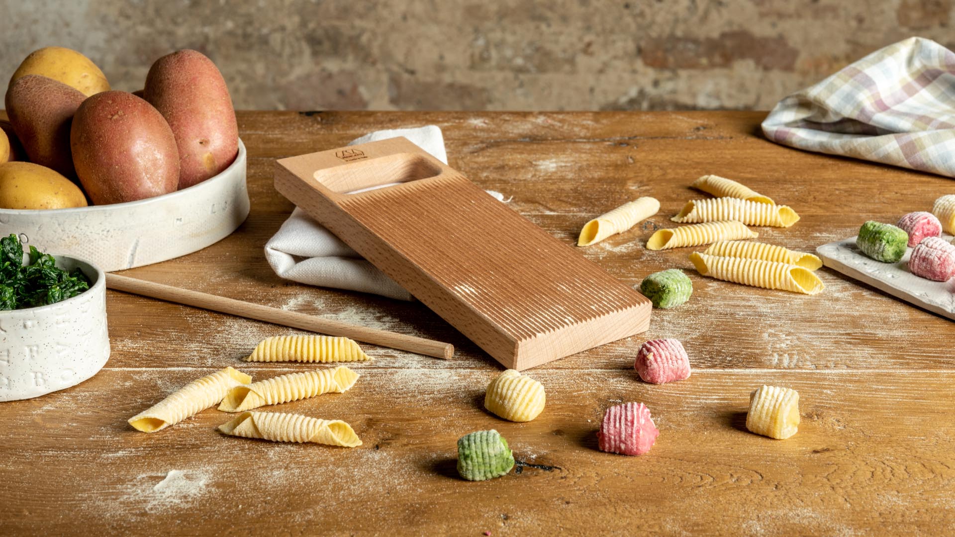 Grazie alla tavola rigagnocchi e all'asta abbinata, entrambe in legno, puoi divertirti a preparare facilmente garganelli, cavatelli e tutti i tipi di gnocchi.